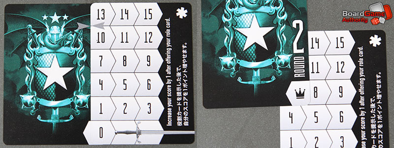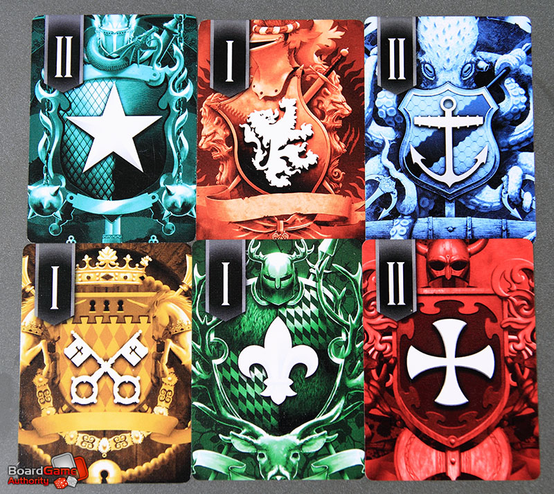 The score card is also a little weird.  Every player gets their own score card, which has to be combined with your house card in order to keep score.  The score card, as well as your house card, is double sided.  Your house card helps keep track of the rounds, but it is also has a crown and must be placed on (or next to) the score card to tally the number of points you’ve gained.  It is easy for these cards to fall out of alignment and have you question what your score was.  The rulebook makes it look like the arrows on the cards should line up, or that the arrow should point to your score, but this isn’t the case.  When placed on (or next to) the score card, the crown on the house card combines with a number on the score card to form a hexagon.  The number in this shape is your current score.