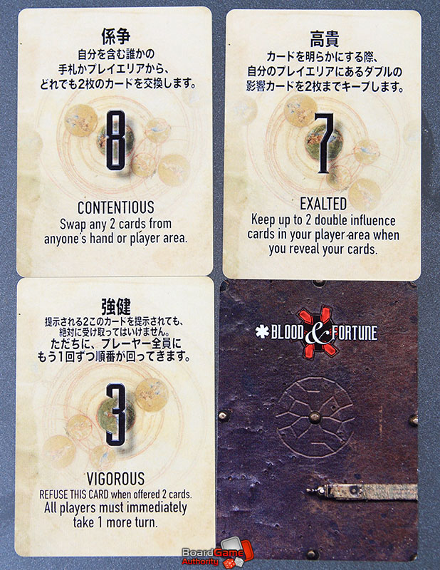 The strategy of the games comes down to when to offer your double Influence cards, when to accept them, and who to offer them to.  Smart players will quickly figure out that if you offer both of your double Influence cards to the same opponent, they have to accept one.  This play guarantees you’ll have a double Influence card on the table.  However, it doesn’t guarantee it will be the most recent double Influence card that player accepted.  Timing is vastly important in Blood & Fortune.