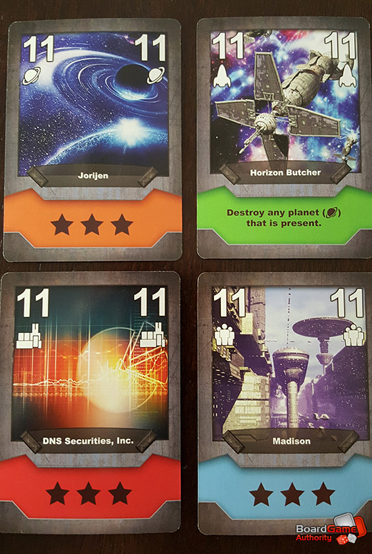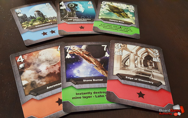 The card quality is above average, with a nice silken gloss and average to above average thickness. They shuffle very well without the fear of creasing or bending the cards. As well, I am very impressed with the artwork on each card. For the first 30 minutes after opening the game for the first time, I merely sorted the cards out by type, and just admired the artwork. Each ship, planet, colony and industry card has a distinct look.