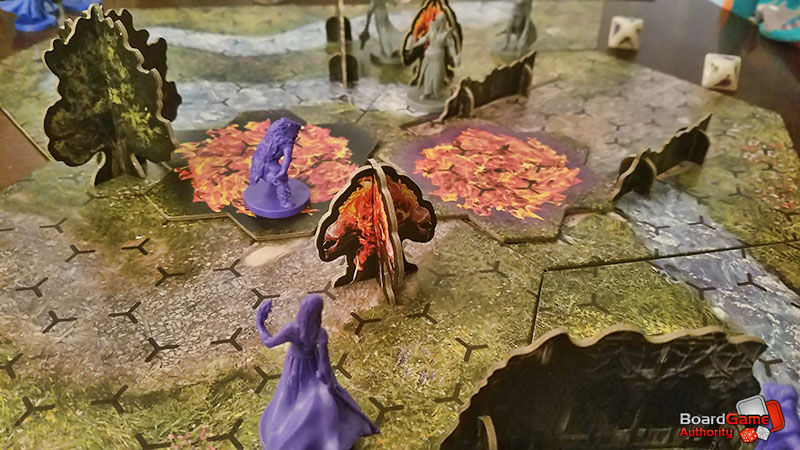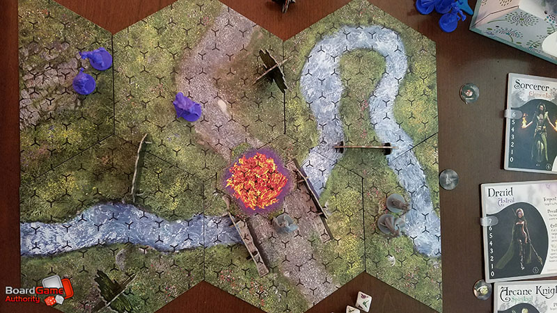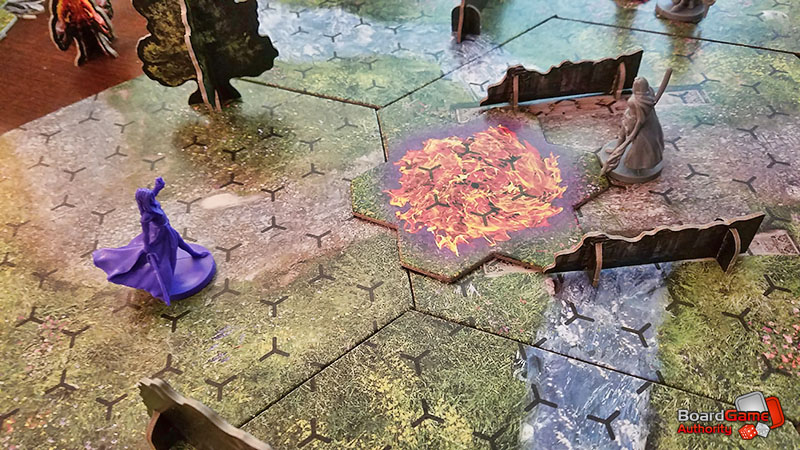 This limited number of actions (move and activate) really causes you to plan your turns. Frequently, I found myself wishing I could have another activation. Some of the spells could really combo if even two activations were allowed. Combos can still happen, and your band of wizards are really meant to work well together and have complementary powers, but you’ll need to plan a little for them. Finding the combos and figuring out how your party of wizards all work together is part of the fun of playing Incantris. An example: casting Blaze, which is a type of firetrap, with the Sorcerer and pulling/pushing an enemy into it with the Shaman’s Primal Reach power.
