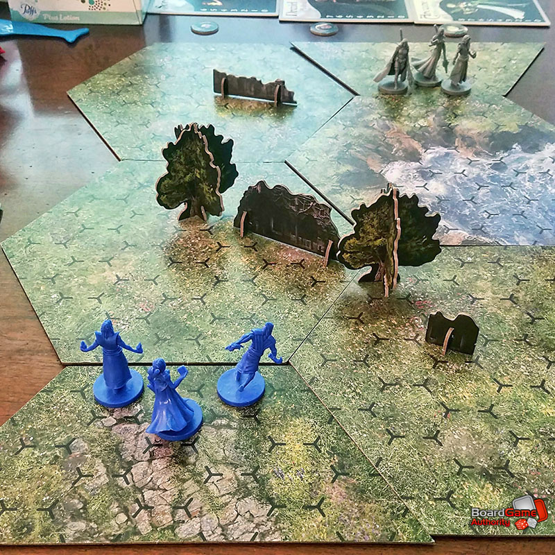 There is a lot of game inside the box, and Incantris offers a high amount of replayability. The box contains 12 miniatures (in six different sculpts), 8 double-sided full hex tiles, 6 double-sided half hex tiles, tokens, and cardboard scenery (trees and walls). That’s a lot of bang for your buck.
