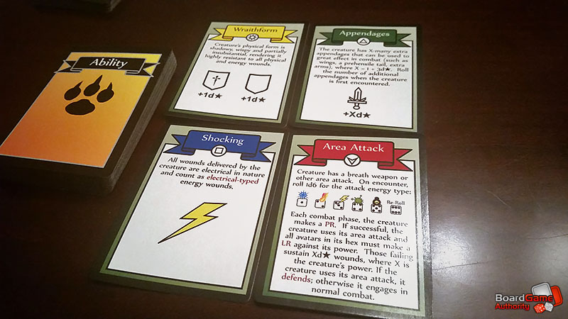 Unique to any board game I have played, and hearkening back to my old role-playing days, is a Creature Generator tile which is used to determine the nature of any beast encountered. Dice are rolled and compared against three lookups. First, the type of creature is determined, and is influenced by the type of terrain the encounter transpires in. Creature type could be Avian (bird/flying), Sectoid, (insect), Reptilid (reptile), Mammal (dog, humanoid, etc.), Arboran (plant/tree), Protean (shape-shifting, like gelatinous, slime, or ooze), Terrovan (earthen/mineral/rock/metal), or Ichthyic (fish and other aquatic creatures). This is not merely superficial, as certain abilities, scrolls, and treasure have impacts versus certain creature types. Second, the creature “power” or strength is determined. This influences the overall health the creature has, bonus damage it deals, and combat dice the creature rolls. Lastly, the final die determines the quantity of special abilities that the creature has. Therefore, in the forest, an Avatar could encounter a large lizard, capable of area attack of various energy types. Or in the desert, an encounter could be had with a giant two-headed scorpion with four pincers and the ability of “thunderous”, generating a terrifying shriek or noise which demoralizes the Avatar and grants a penalty to hit in combat. The variations are endless, and rely on the