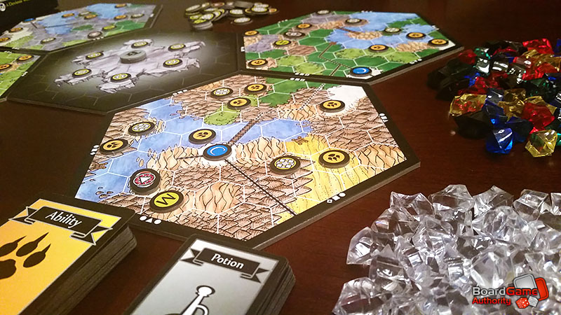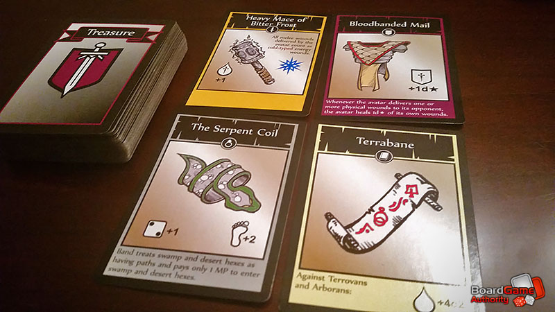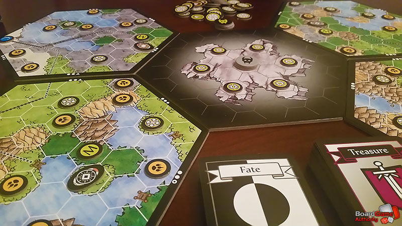 ability deck, treasure deck, Fate deck, and potion deck) are shuffled and placed nearby, and Avatars are placed on a Gate Hex of their choosing.