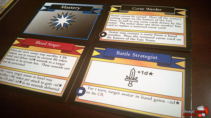Banding is an aspect of gameplay where two or more Avatars can act as a group to yield specific advantages and restrictions. Without going into immense detail, banded Avatars get bonuses to combat by using the highest die rolled in the group, but also take a movement penalty by being forced to use the lowest movement die rolled amongst the banded individuals. Avatars can band and disband at will, with minimal restriction.