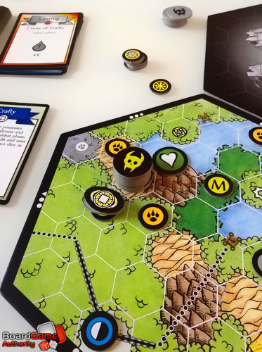 Setup of the game is quite simple. Taking center stage is the map tile for the Shadow Realm, which has six Shadow Gates, initially locked. Hex maps of Aethos are spread around the Shadow Realm, in a quantity to be determined by the players. As there are three strongholds housing Wells on each Hex Board, naturally the more hex tiles to be used in the gaming session, the lengthier the play session will be. In my experience, game length is approximately one hour per map tile in play. Two Dark Wells and one Light Well is randomized and placed on each stronghold per map tile, face down. City tokens are randomized as well, one per map tile, and are placed face-down on the designated map grid. Mystic counters get the same treatment, one per map tile. Finally, stocked lair tokens are placed on the map tile in their prescribed location, to show that a creature inhabits the grid location.