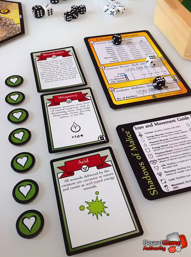 The first thing I noticed about Shadows of Malice is the artwork, which is minimalistic at best. On the surface, one might find this as a disappointment. However, as I marched through my first play of the game, I found the visuals were not a distraction. The theme of the game is carried well by the light art, and events throughout the game contour a storyboard experience, especially for those who hearken back to the glory days of fantasy RPGs.