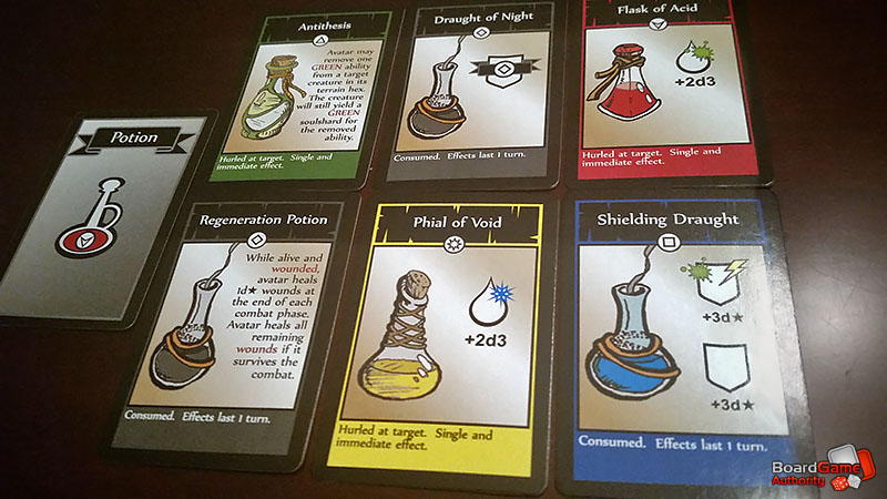 Combat and related damage are determined by die throws by each Avatar or band of Avatars, and compared against the Creature die rolls. Chances to hit are modified by held treasures or expended soulshards for the Avatars, and by Creature abilities for the enemy. At its most rudimentary, the higher die wins the combat round, and health points are reduced accordingly, modified for any ability or treasure contributing to damage. Contained within the combat rules are also pre-combat actions such as activating Masteries or using potions, defending and withdrawing rules, and how to handle reincarnation should an Avatar die. Usually, upon an Avatar victory in combat, treasures and soulshards are awarded and split among the group. Upon dying due to combat wounds, an avatar is reincarnated at a random Gate hex, and will have to choose a new Mastery. Also, procured items before death may either be left behind or destroyed, and there may be a health penalty assessed until healing can take place.