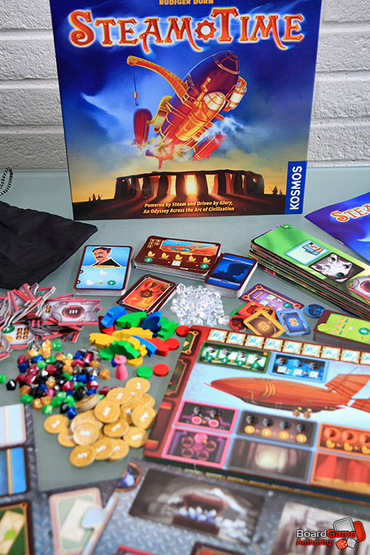 The theme/setting of Steam Time is this: In the current year of 1899, a fantastic discovery of unusual crystals, with spacetime bending properties, has sparked the invention of time travel machines in the form of steam-powered airships. You are the captain of one such airship, and you have been tasked to explore the numerous temporal rifts that are being reported. Ultimately, you want to gain the most glory by managing your resources (steam, crystals, money, and time) better than your competitors.