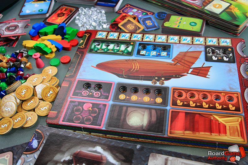 Before jumping into your first time travel adventure, you’ll need to set up the game board. The game board is actually really cool and comes in three pieces that fit together to form an upside down “L”. Game cards, upgrade tiles, crystals, and the score track are all on the game board. In the space created by the “L”, you’ll build the time stream, which contains the available actions for each given time period. Not all actions are available in each time period, and the same action will often yield different results in a different time period. For example, the Mission cards will always be different in each different time period. You’ll also need to set up your own personal airship board. With your personal airship board, you’ll keep track of your steam, money, various crystal types, and any upgrades you purchase.