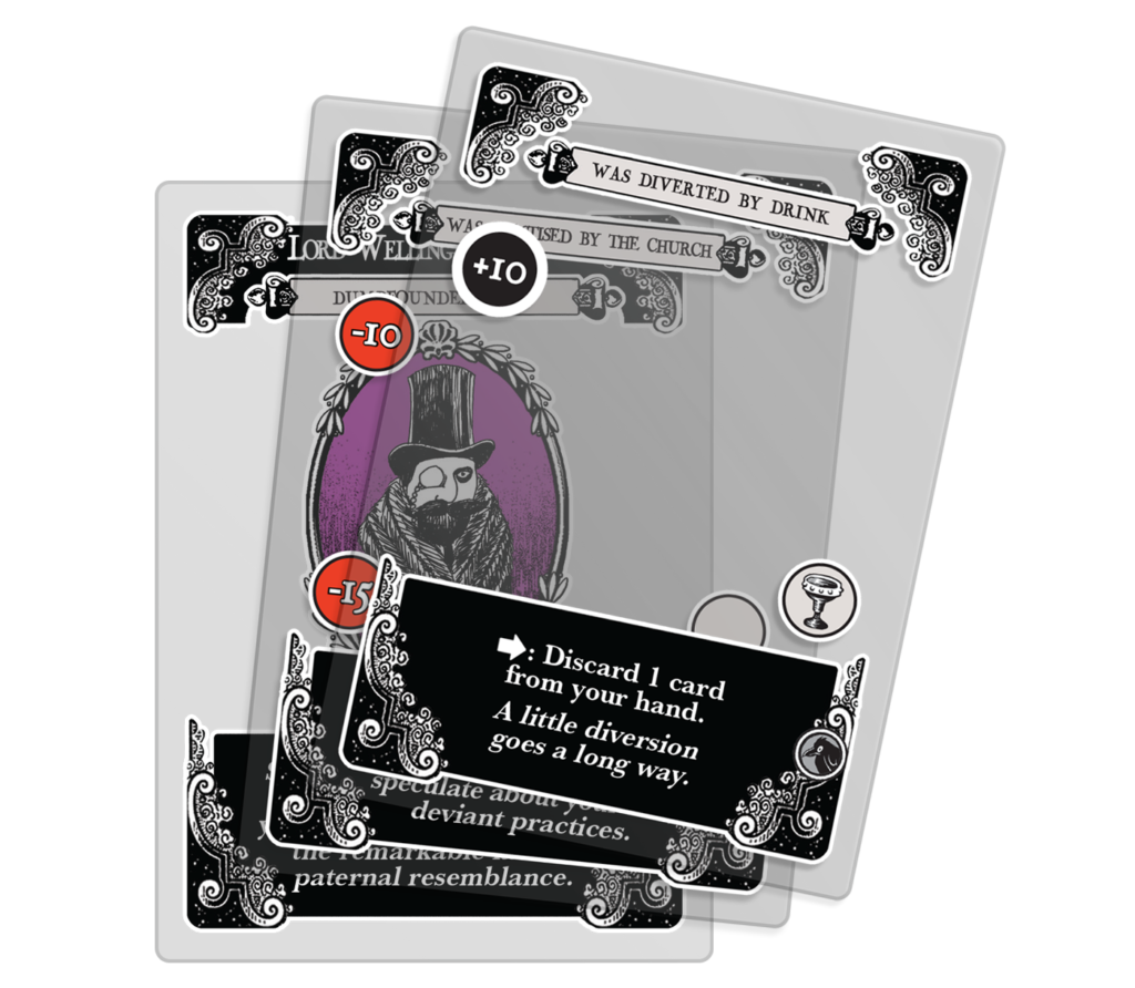 On your turn, you play up to two cards (modifying your characters or interfering with your opponents’), then draw back up to your hand size. The transparent cards stack in a clever way—some modifiers cover up previous effects, altering not only point values but even personality traits and story elements.