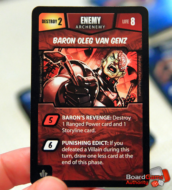 Heroes of Metro City improves on some design elements of its forefathers. Primarily, each part of a card (and other components) is numbered. These numbers correspond to the turn sequence, which is very helpful to those new to deck builders or new to this game in general. Numbering the different special abilities and other game aspects in this way really helps to cut down on any potential confusion that might arise. This is a very nice feature that I’d like to see incorporated in other games.