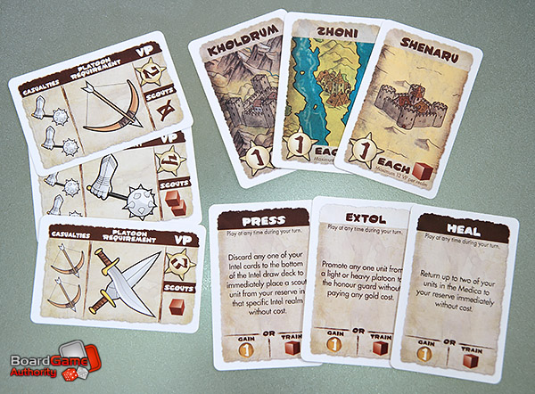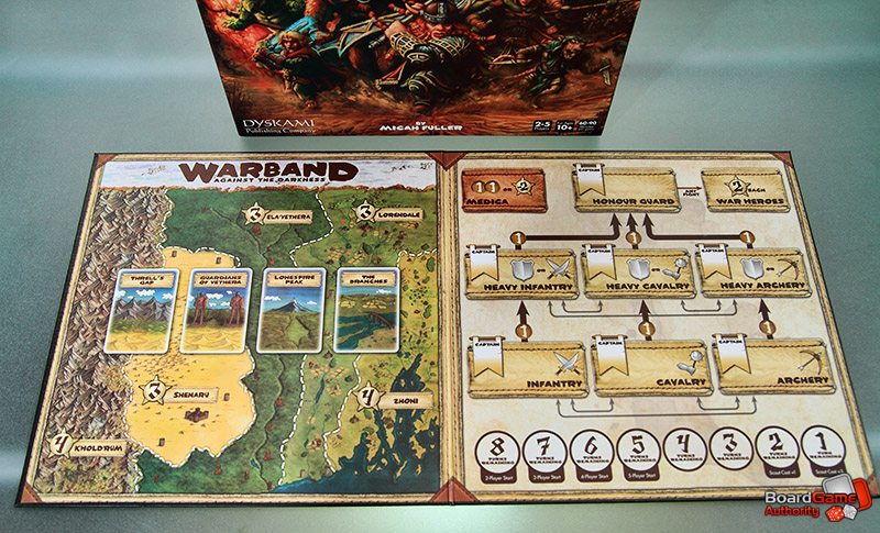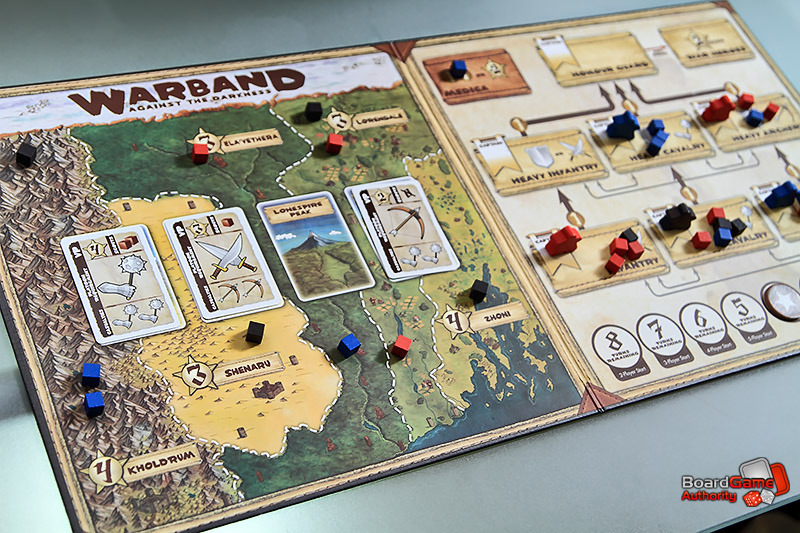 The warband roster board is largely what makes the game. It is cleverly designed and represents the shared warband strength/composition between you and the other players. Units can move up the ranks, physically represented by a colored cube, and each player determines if they will train infantry, cavalry, or archers. You need to keep a close eye on the roster as it is easy to help your opponents win battles while your units die.