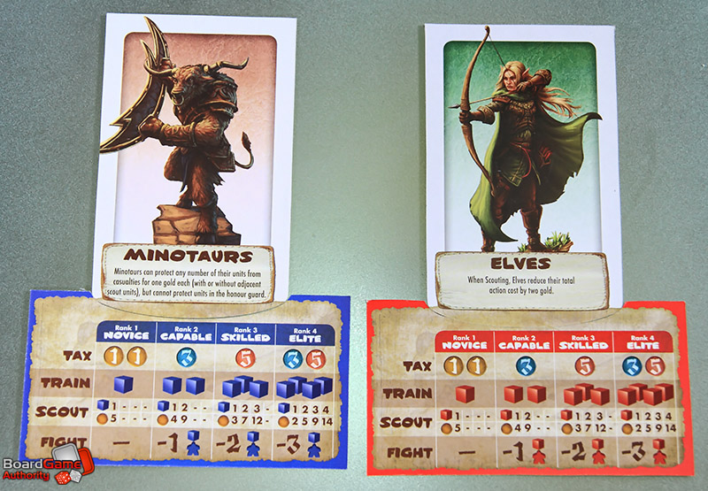 The available actions are Tax, Train, Scout, and Fight. You can upgrade each of these actions to Rank 4, which provides some nice bonuses. Upgrades include gaining more gold during your Tax action, moving multiple units within the warband platoons, reduced cost for placing scouts, and requiring fewer units to win battles. Managing which action you will upgrade is a fun and crucial part of achieving victory.