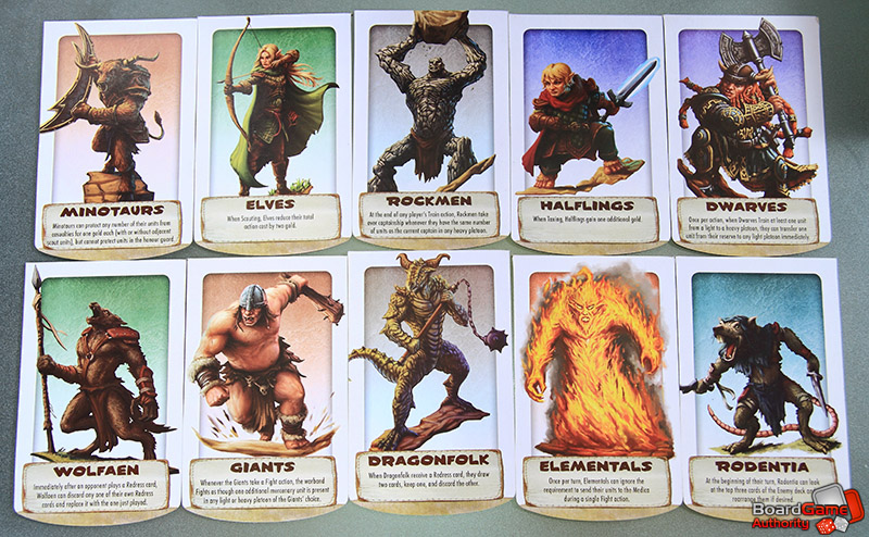 Warband: Against the Darkness is fun, engaging, and well designed. The mechanics and theme go well together and allow for challenging and satisfying gameplay. In Warband: Against the Darkness, players take on the role of popular fantasy races, such as dwarves, minotaurs, elves, and giants. Each race, there are ten in the core game, have unique abilities that provide some type of advantage. The Halflings, for example, gain an extra gold when performing the Tax action. In the fantasy realm of Kholdrum, these brave inhabitants have banded together to fight the Darkness. The Darkness is an ancient evil that spares no one, and brings death and destruction to each of the great races equally. In an effort to survive, the great races of the Five Realms of Kholdrum put aside their differences and are working to build an army large enough to beat back the forces of Darkness.